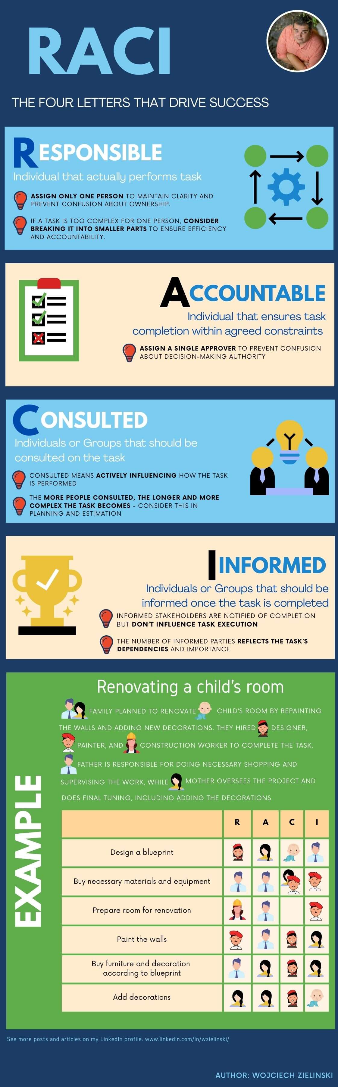 And the main rule that will help you be successful is to follow how many people can be attached to each of these categories within specific task or decision. You might have already noticed that in case of Responsible and Accountable I was writing only about Person, while for Consult and Inform I mentioned also in brackets People. And that was done in purpose - since Responsible and Accountable are actually a drivers of the task or decision (in many cases that might be one person, but not necessary and always), Consult are the people supporting and Inform are in most cases people dependent of the task or decision.